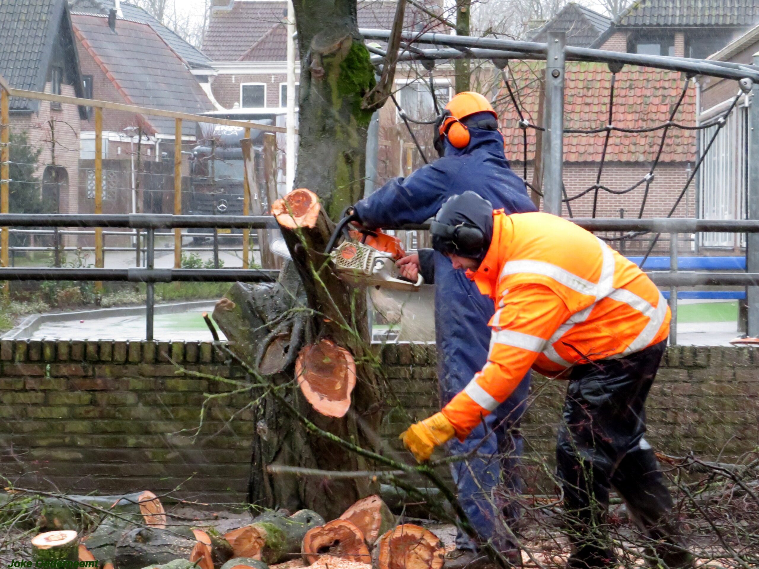 Maar natuurlijk ook de vele takken die alsnog het hadden begeven na storm nummer twee en een gevaar werden voor de omgeving Ook die werden her en der een kopje kleiner gemaakt.