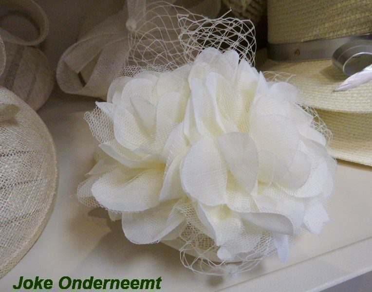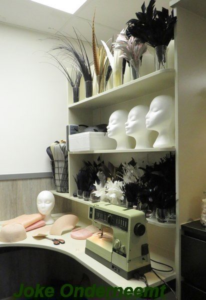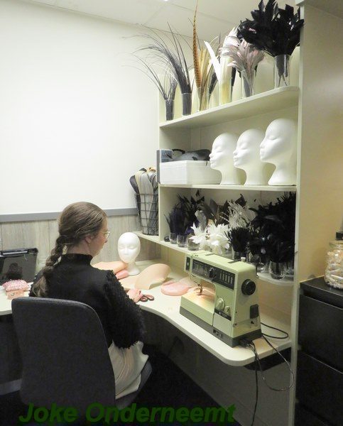 In haar atelier staat alles keurig gesorteerd van veel soorten veren, linten , stoffen , strikjes, sierband enzovoort , en dat is ook echt “haar plekje”.