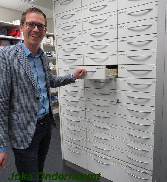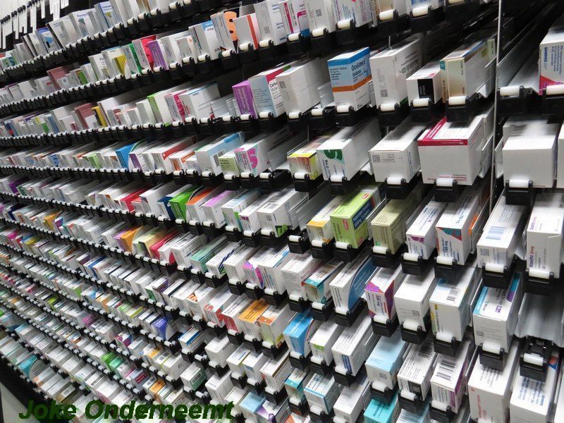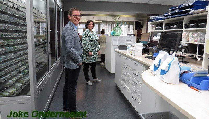 Ik kreeg nog even een rondleiding door de hele apotheek van Steven en Andrea , dat was heel leuk want verder dan de balie kom je nooit. Wat ontzettend groot is het daar achter . Niks geen stapels papieren meer alles automatisch natuurlijk, en de tijd van zelf zalfjes maken is ook voorbij.. 1 tik op de computer en je 3 soorten medicijnen worden door de robot uit de enorme kast getikt en vallen gewoon op de werkbalie… wat een wereld van verschil met jaren terug.. en terecht is Steven van Welie nu al trots op “zijn” apotheek !