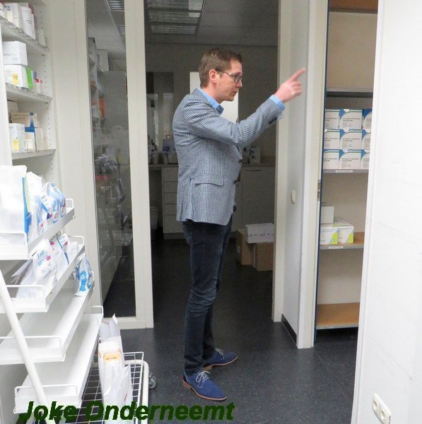 Hij wil graag niet alleen apotheek zijn maar ook als apotheker zichtbaar zijn als zorgverlener…. niet alleen de pillendoosjes afgeven, maar ook echt zorg verlenen bij patienten over hun medicatie in samenwerking met de artsen.. Dus ja het is even wennen een man tussen de dertien dames die er werken . Maar regelmatig zal hij ook rondlopen en zeker niet alleen achter zijn bureau zitten…en ook bij hem kunt u zo nodig terecht als u advies nodig heeft. Zijn kantoor is nog wat kaal op de foto maar Andrea heeft haar spullen meegenomen en nu kan Steven het weer gezellig inrichten naar zijn smaak eerdaags.