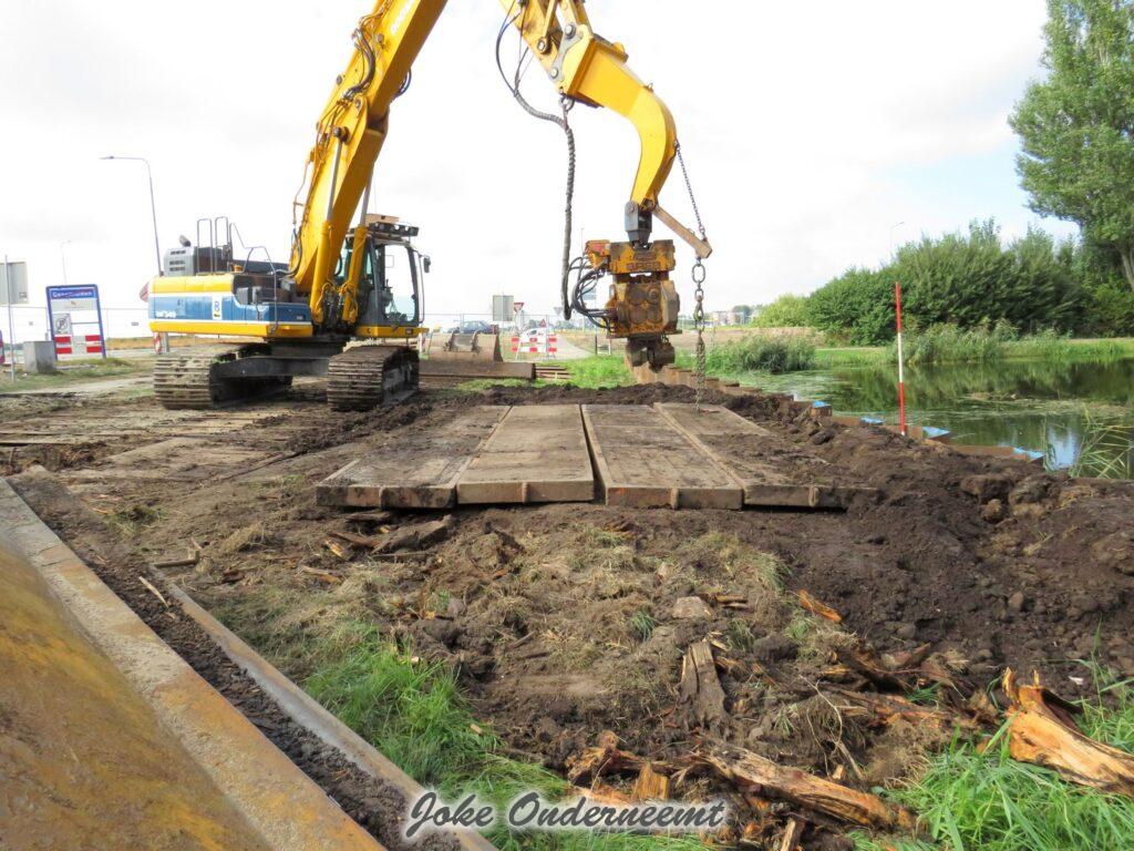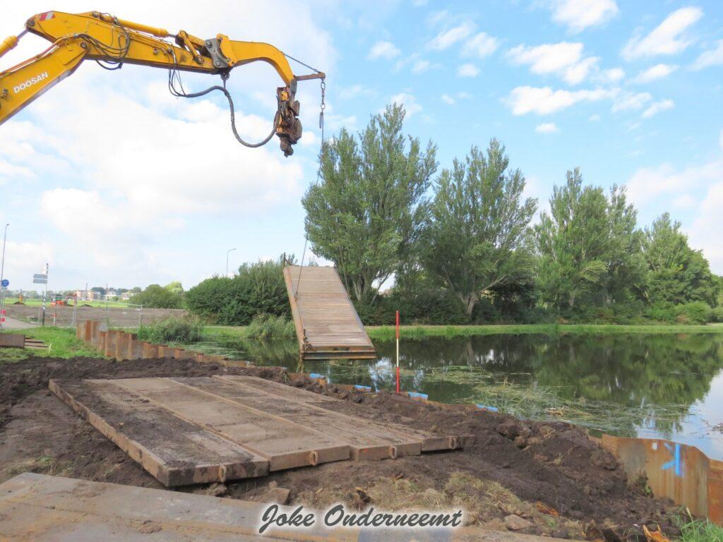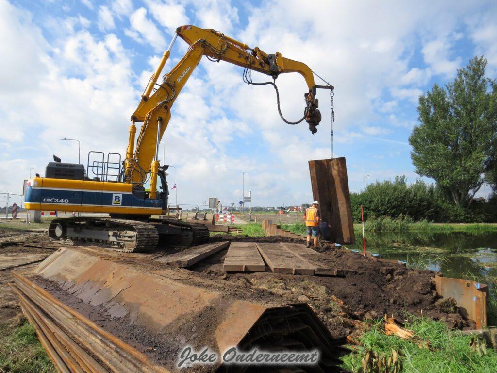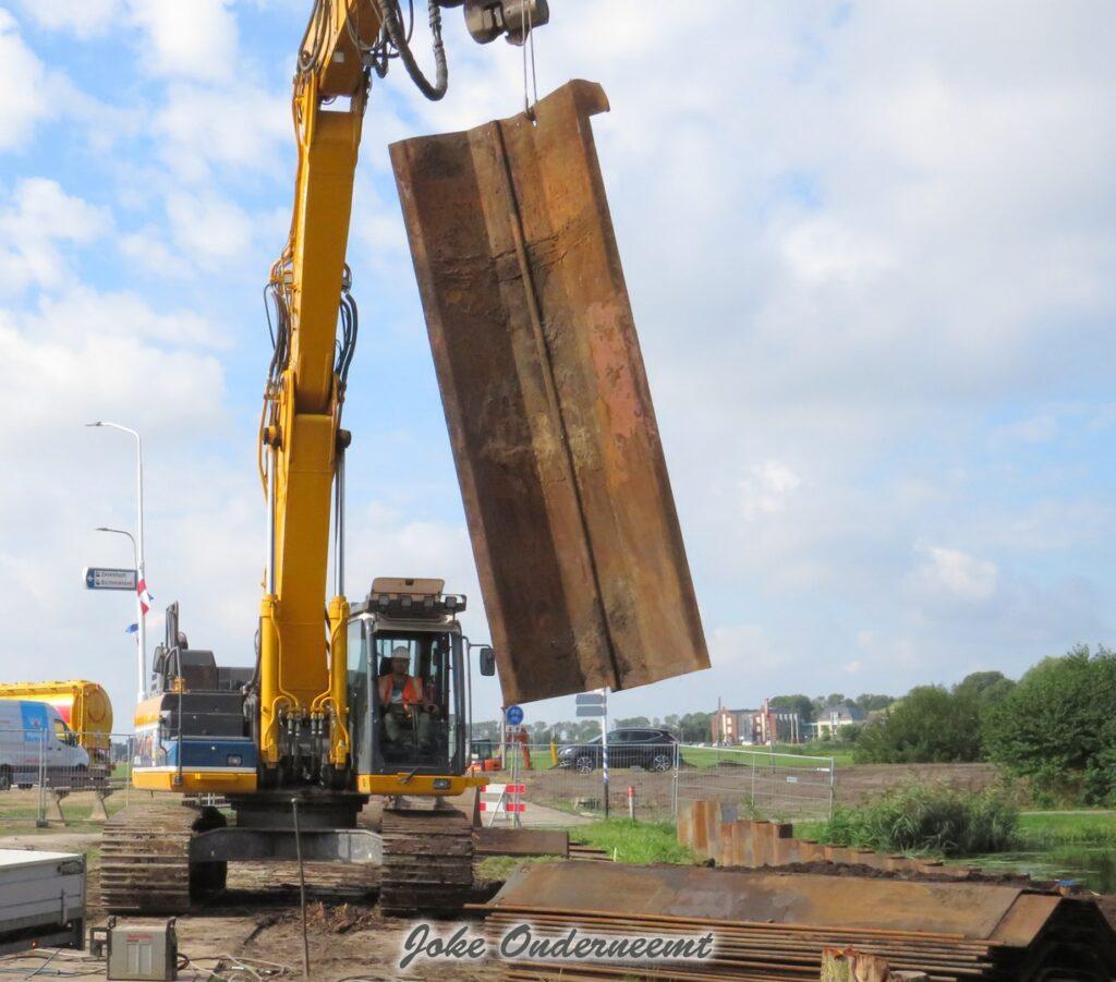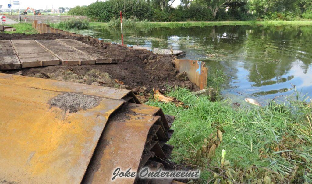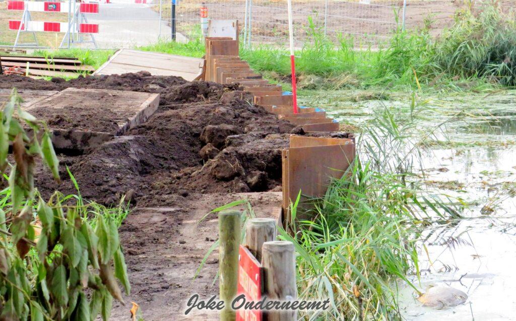 Maandag is de aannemer Bouwhuis BV weer begonnen met de voorbereidende werkzaamheden, zoals bouwhekken plaatsen rondom het werkterrein, en de rijplaten leggen. Inmiddels zit de damwand erin en zijn ze bezig de “werkplek” te maken waar de duiker komt.. als deze werkplek in het water klaar is kan de firma Luinstra bronbemaling beginnen met het wegpompen van het water zodat men kan beginnen.