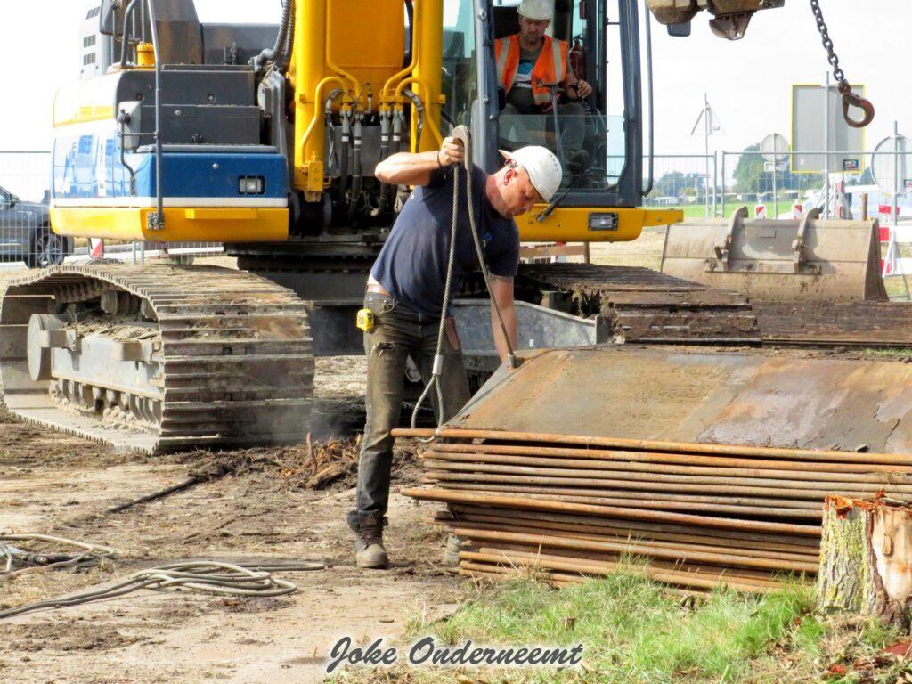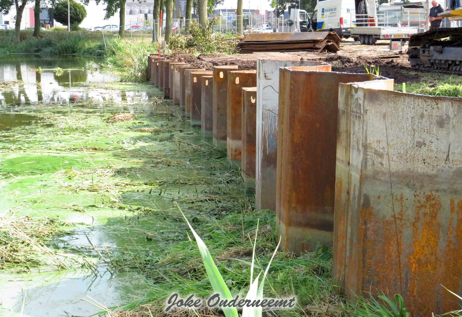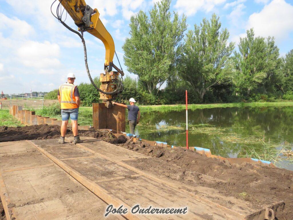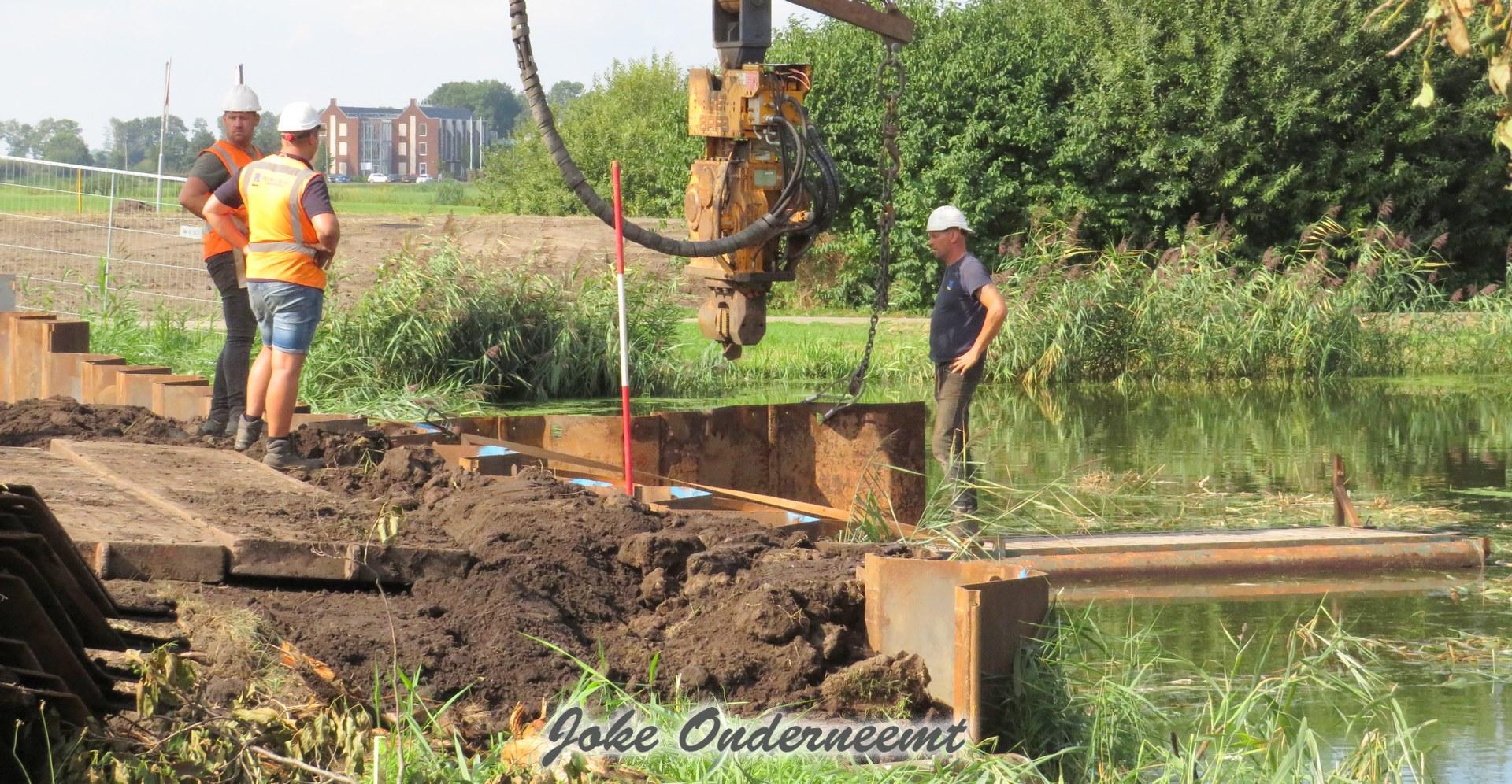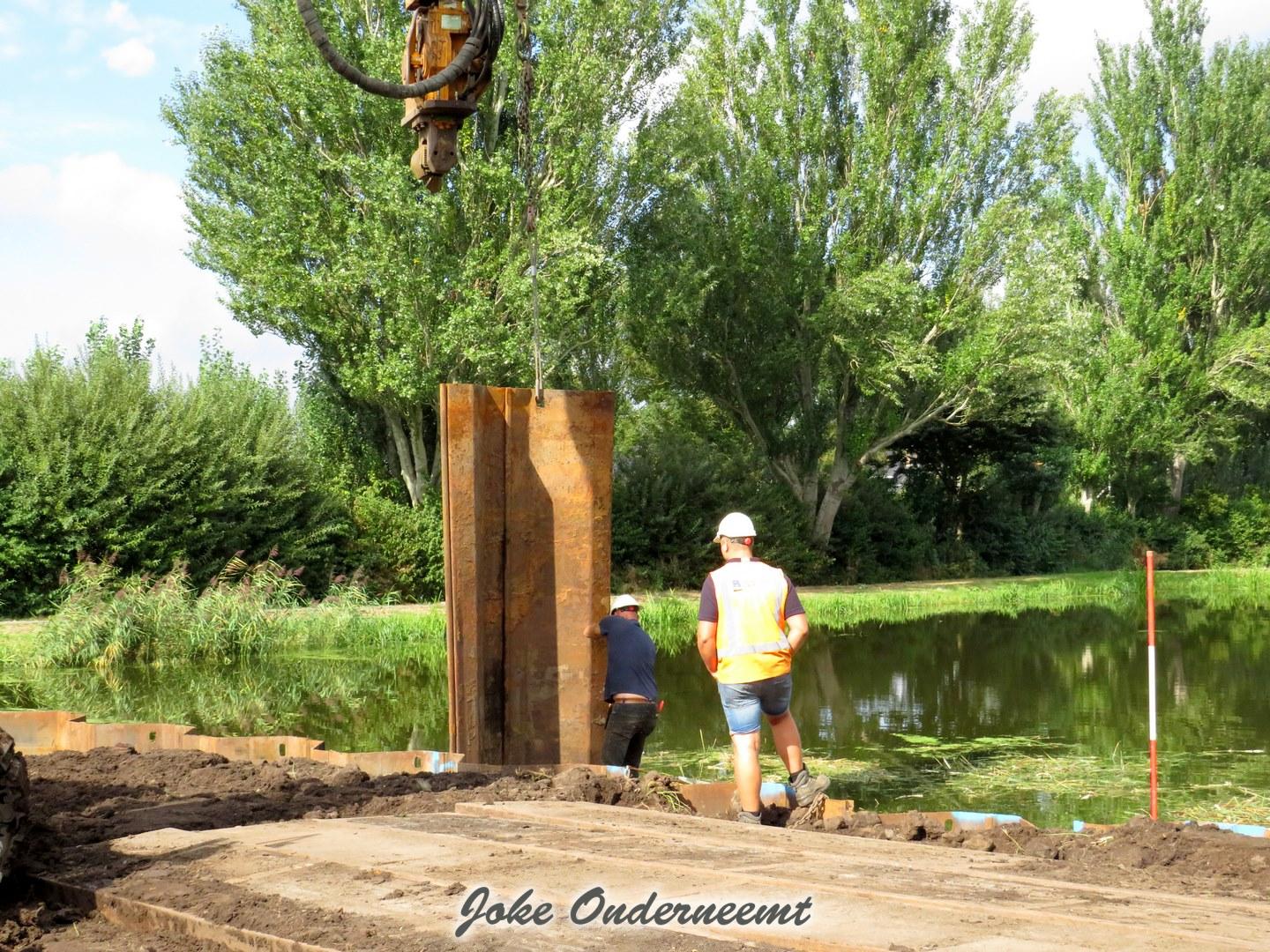 Maandag is de aannemer Bouwhuis BV weer begonnen met de voorbereidende werkzaamheden, zoals bouwhekken plaatsen rondom het werkterrein, en de rijplaten leggen. Inmiddels zit de damwand erin en zijn ze bezig de “werkplek” te maken waar de duiker komt.. als deze werkplek in het water klaar is kan de firma Luinstra bronbemaling beginnen met het wegpompen van het water zodat men kan beginnen.