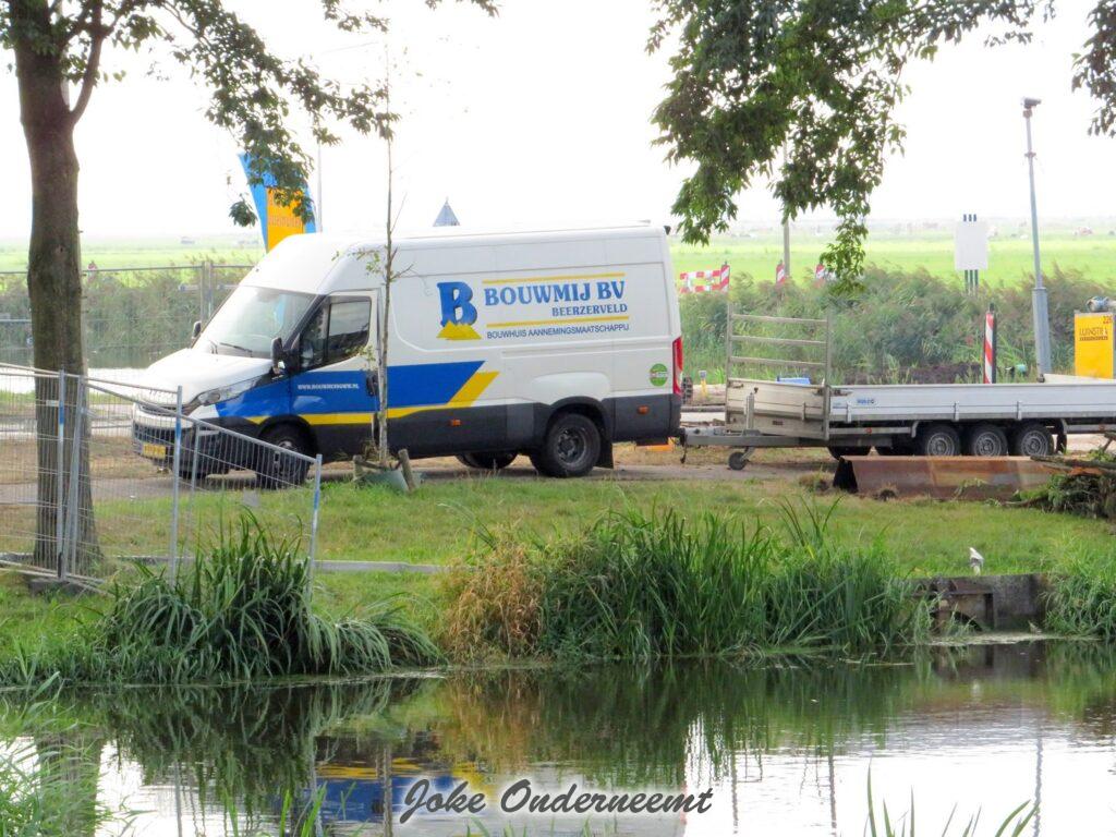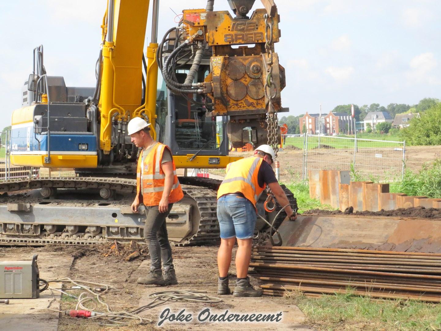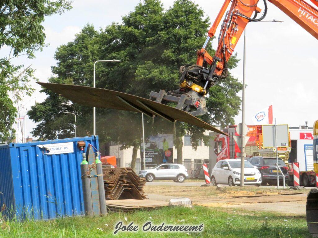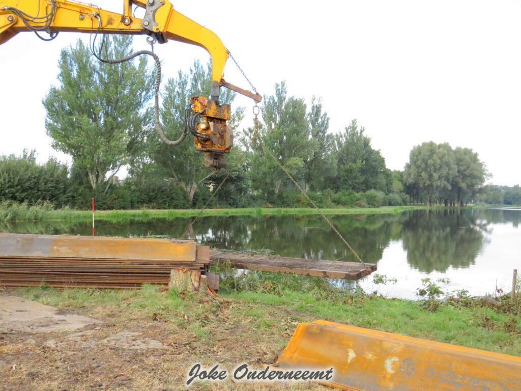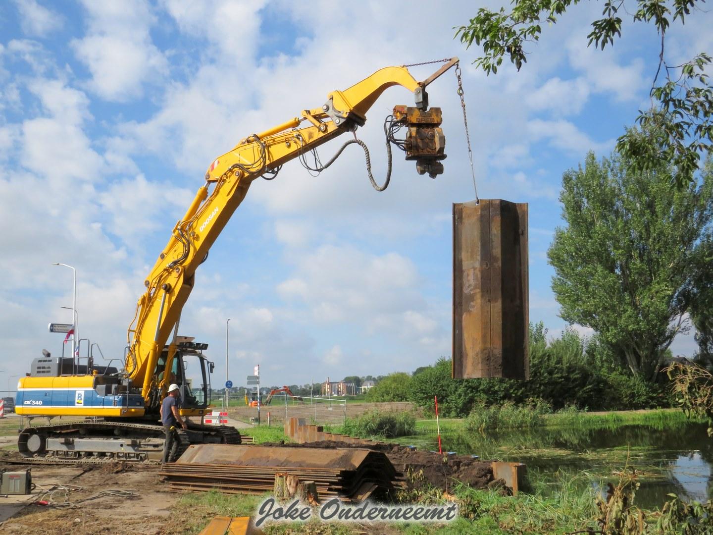 Maandag is de aannemer Bouwhuis BV weer begonnen met de voorbereidende werkzaamheden, zoals bouwhekken plaatsen rondom het werkterrein, en de rijplaten leggen. Inmiddels zit de damwand erin en zijn ze bezig de “werkplek” te maken waar de duiker komt.. als deze werkplek in het water klaar is kan de firma Luinstra bronbemaling beginnen met het wegpompen van het water zodat men kan beginnen.